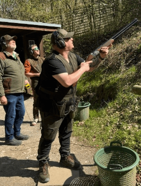 Franz, mit unserer Trainerin, beim erfolgreichen Schuss, auf zwei der fliegenden Ziele.